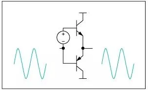 <center><i>图2 .B类音频放大器中,输出晶体管仅在信号波形的半周期(180°)期间导通。为放大整个信号,使用两个晶体管,其中一个在正向输出信号导通,另一个在负向输出信号导通。</i></center>