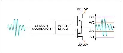 H类放大器调制其电源电压,最大程度减小输出级的压降。实现方法包括从使用多个分立式电压到无限可调电源等。尽管与G类放大器降低输出器件功耗的技术相类似,但H类放大器结构不要求多个电源(图7)。