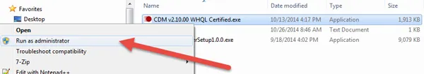 2、右击下载的 .exe 文件(名为 “CDM…”),然后选择 “Run as Administrator”: