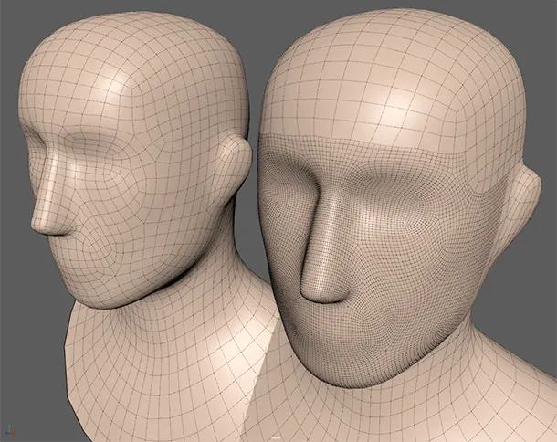 <strong>图 3:</strong> 头部模型资产和高度细分的面部。扫描面部将从高分辨率区域开始拉伸。