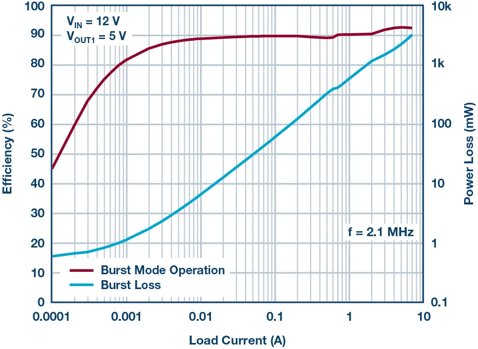 在睡眠模式下,升压转换器和其中一个降压转换器导通时,LTC7815仅消耗28 μA电流。三个通道全部处于睡眠模式时,LTC7815仅消耗20 μA电流,使得空闲模式下的电池运行时间大幅延长。这是通过将LTC7815配置为高效Burst模式来实现的,该器件向输出电容提供 短时突发电流,随后进入睡眠期,此期间仅通过输出电容将输出功率输送给负载。图2为这种工作方式的概念时序图。