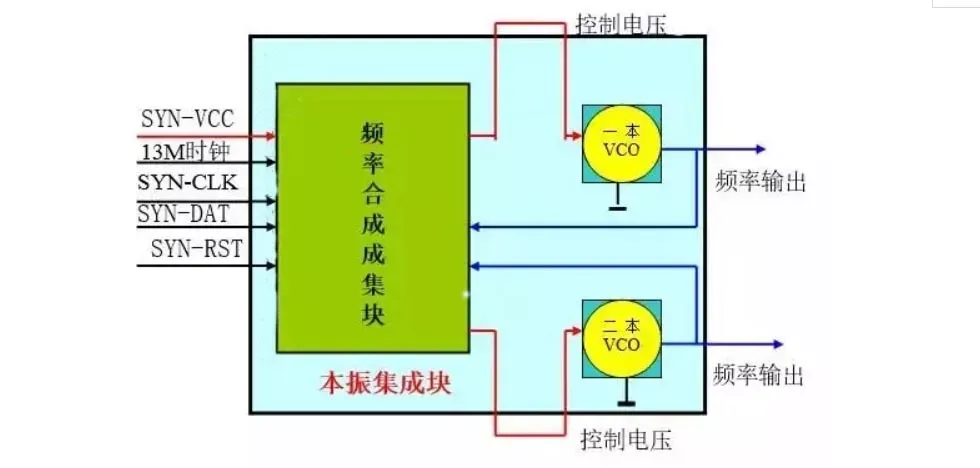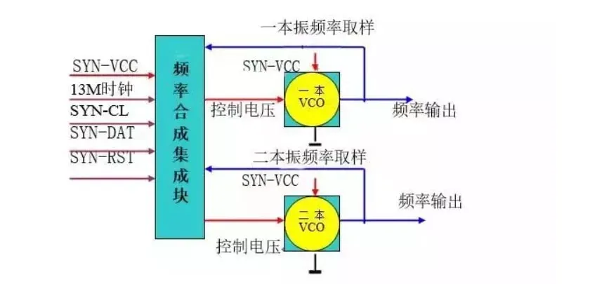 a)由频率合成集成块、接收压控振荡器(RX-VCO)、13M基准时钟、预设频率参考数据(SYN-DAT、SYN-CLK、SYN-RST、SIN-EN)组成(如下图)。