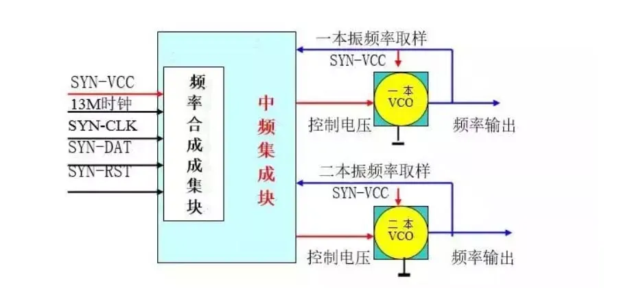 b)把频率合成集成块集成在中频内部,结合外接RX-VCO组成(中期机、诺基亚机多用,如下图)。