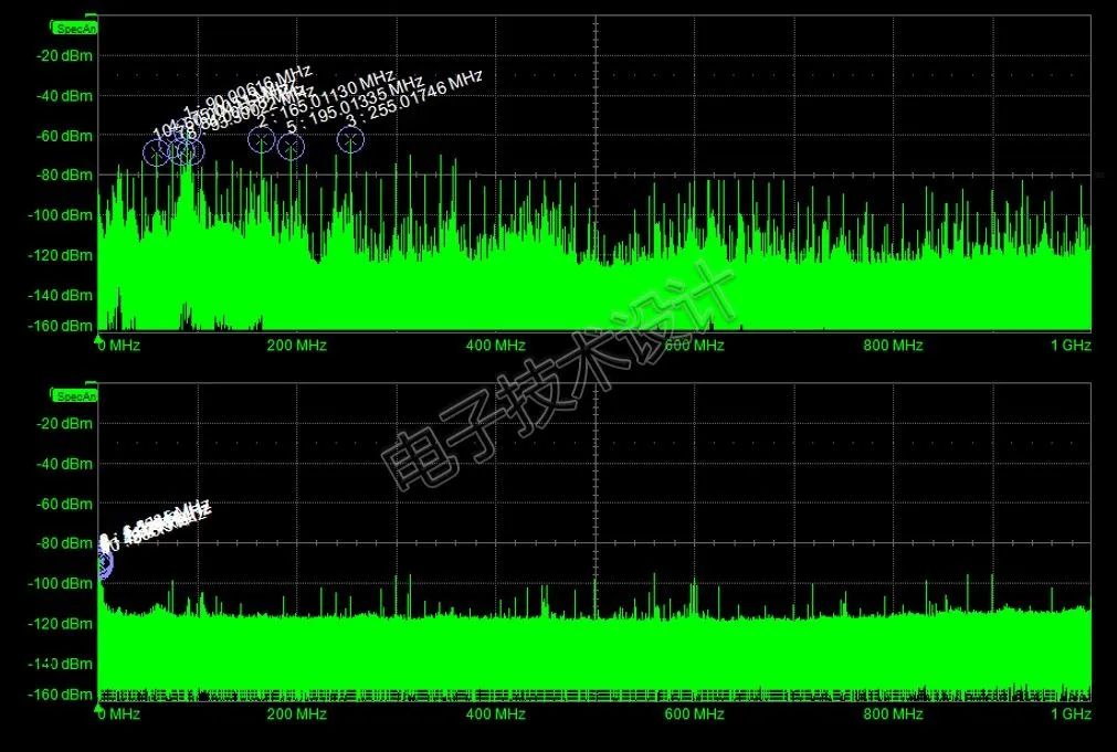 图2中下部波形显示了噪声频谱的前100MHz的放大图,它显示出明显的噪声峰值,奇怪的是,它几乎从15MHz开始,接着是30MHz,45MHz,依此类推,这无疑是来自外部的RF噪声。