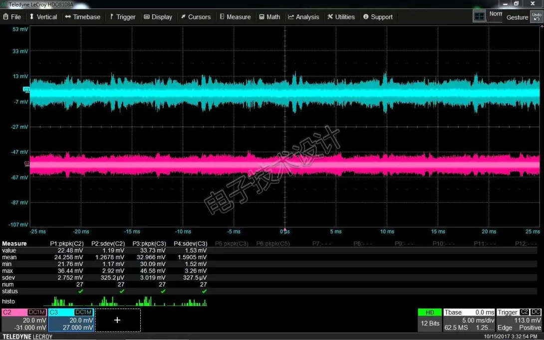 最后我们做最终的完整检查,将适当屏蔽的电池噪声与示波器的基底噪声进行比较(图5)。示波器基底噪声在通道1(黄色,下部波形)和电池噪声在通道2(粉红色,上部波形)上,它们几乎是相同的。