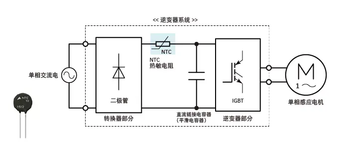 逆变器系统包括转换器部分、逆变器部分和安装在转换器部分之后的直流链路电容器(平滑电容器)。启动时,装置充电,以峰值比稳定电流大几倍的励磁涌流将直流链路电容器充满。这种励磁涌流可能对直流电容器的使用寿命产生有害影响或破坏半导体器件。为了防止励磁涌流,需要连接NTC热敏电阻(电源热敏电阻)。