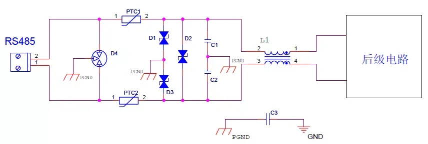 为了达到IEC61000-4-5或GB17626.5标准,共模6KV,差模2KV的防雷测试要求,D4为三端气体放电管组成第一级防护电路,用于抑制线路上的共模以及差模浪涌干扰,防止干扰通过信号线影响下一级电路。