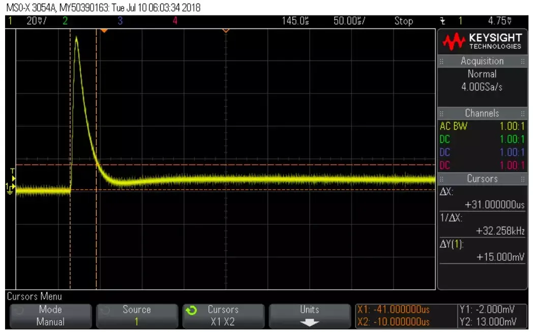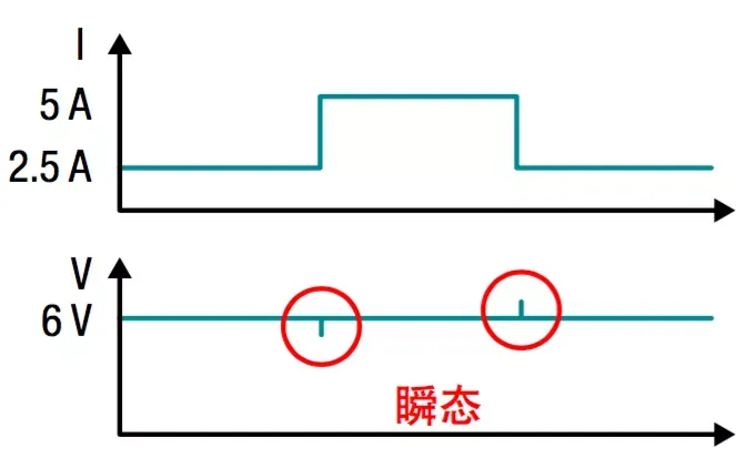 直流电源上的输出阻抗,也会造成类似的电压瞬变。对电流的需求突然增加时,电源的输出电压就会瞬间下降。同理,电流的下降会导致电源电压突然升高。瞬态响应是电源在负载的巨大变化中恢复正常的速度。例如,对于E36312A来说,当电流从50%变到100%时,其恢复到15mV的瞬态响应时间是50us。通道1的最大电流是5A,50%就是2.5A。
