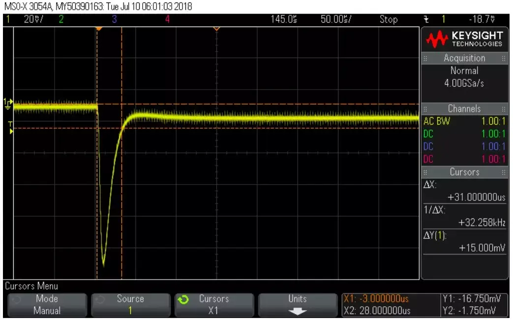 <center><img src="http://mouser.eetrend.com/files/2019-12/wen_zhang_/100046722-87358-6.pn…; alt=“” width="600"></center><center><i>图5a:在E36312A的通道1上进行瞬态测量。在电流从满负载减至一半以后,电压在30us内恢复至15mV,反之亦然</i></center>