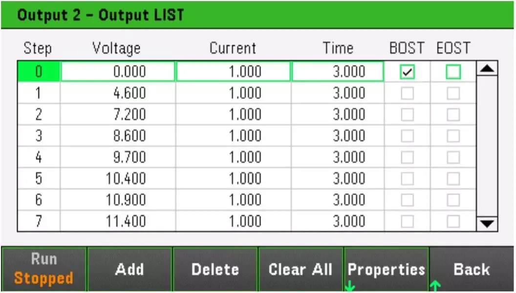 如图7所示,我们可以利用Keysight E36312A台式电源的前面板来输入列表。在这个示例中,您希望将电源用作电压源,而且电流要高于灯泡所需的较大值。BOST(步进开始处触发)和EOST(步进结束处触发)可以用来在一个步进的开始和结束处生成外部触发。