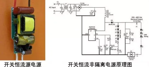 采用变压器将高压变为低压,并进行整流滤波,以便输出稳定的低压直流电。开关恒流源又分隔离式电源和非隔离式电源,隔离是指输出高低电压隔离,安全性非常高,所以对外壳绝缘性要求不高。非隔离安全性稍差,但成本也相对低,传统节能灯就是采用非隔离电源,采用绝缘塑料外壳防护。