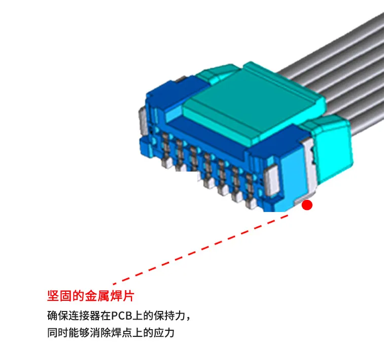 此外,连接器插座上设计有坚固的金属焊片,保证连接器在PCB上的保持力,同时能够消除焊点上的应力,使得连接器能够经受得住环境外力的影响。
