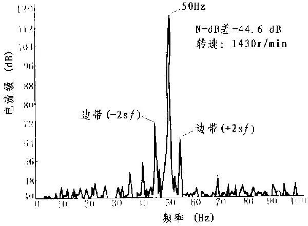 <p>电流波形或振动波形频谱图中,基频两边出现±2sf<sub>0</sub>的边频,根据边频与基频幅值之间的关系,可判断故障的程度。</p>