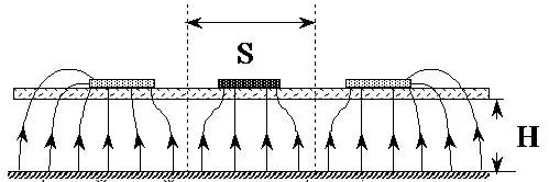 由印制线与参考接地板之间的寄生电容计算公式1 可知,印制线与参考接地板之间的寄生电容大小取决于印制线与参考接地板之间的距离(即公式1中的H)和印制线与参考接地板之间形成电场的等效面积(即公式1中的S)。