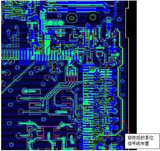 <center><img src="http://mouser.eetrend.com/files/2020-09/wen_zhang_/100052785-106834-5.j…; alt=“图5 修改后的复位信号线布置PCB实图” ></center><center><i>图5 修改后的复位信号线布置PCB实图</i></center>