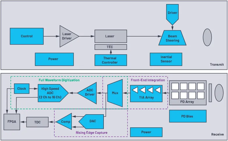 <p><a href="https://www.analog.com/en/design-center/evaluation-hardware-and-softwar… href="https://static4.arrow.com/-/media/arrow/files/pdf/0819-lidar-product-br…;高性能的LIDAR原型制作平台</a>,也是905 nm脉冲直接ToF LIDAR开发套件。使用这个系统可以快速构建机器人、无人机、农业和建筑设备,以及采用1D静态闪光配置的ADAS/AV的原型。这个参考设计中选用的组件主要是针对长距离脉冲LIDAR应用。该系统采用905 nm激光源,由高速、双通道4 A MOSFET <a href="https://www.analog.com/cn/products/adp3634.html">ADP3634</a>驱动。它还包括由可编程电源 <a href="https://www.analog.com/cn/products/lt8331.html">LT8331</a>供电(用于生成APD电源电压)的First Sensor 公司的16通道APD阵列。包括多个低噪声、高带宽的4通道 <a href="https://www.analog.com/cn/products/LTC6561.html">LTC6561</a> TIA,一个<a href="https://www.analog.com/cn/products/AD9094.html">AD9094</a> AD9094 1 GSPS、8位ADC,其在通道上的功耗最低,为每通道435 mW。 我们的设计需要继续增大带宽和采样速率,以帮助提高整个系统的帧率和范围精度。与此同时,需要最大限度降低功耗。这是因为散热减少可以简化热/机械设计,从而帮助模块减小外形尺寸。</p>