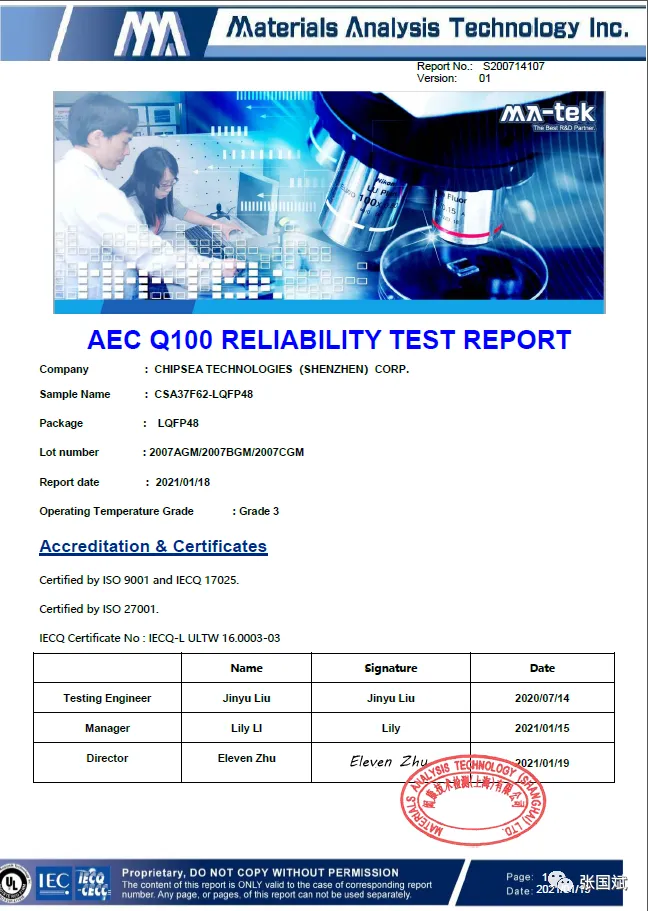 <p>据介绍,芯海科技AEC-Q100认证项目严格按照标准进行测试,从项目前期准备到产品测试再到认证发布,整个认证历时一年多,进行了多项可靠性测试,充分展示了芯海对产品品质的重视。最终,在团队的共同努力下,CSA37F62-LQFP48产品顺利通过了加速环境应力可靠性检验、加速寿命模拟可靠性验证、封装可靠性检验、芯片晶圆制程可靠性检验、电学参数验证、缺陷筛选检验等一系列车规级认证。</p>