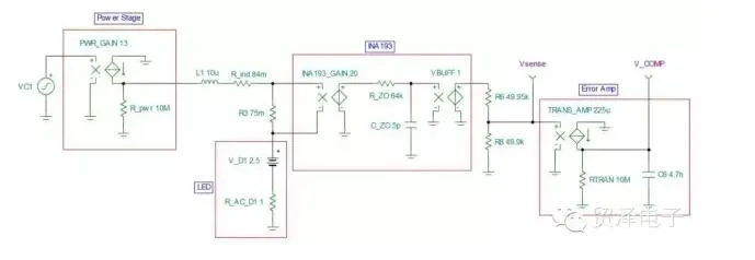 图2是仿真控制回路的图1的简单SPICE模型。VC1是COMP引脚上的电压,直接驱动跨导增益为13的功率级(控制器更多的内部细节请参见TPS54218数据表内的图31)。这个电流通过电感器和感测电阻器来直接驱动LED。需要注意的是,电感值和LED值的变化不会对响应产生影响,这是因为电感器中的电流受到了控制。