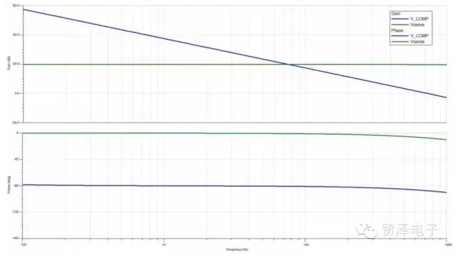 外部补偿组件C6从这个点 (V_COMP) 上接地。需要注意的是,V_COMP也是我们回路仿真的起始点 (VC1)。回路增益是V_COMP引脚上测得的电压除以VC1上的注入扰动。所以,通过将VC1设定为1 Vac信号,回路增益最终就是V_COMP上测得的电压。