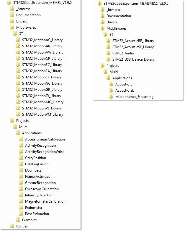 现在,这些都不需要了!您不需要一遍遍地重复重复再重复……最新的X-CUBE_MEMS1和X-CUBE-MEMSMIC1软件包已经将所有软件算法包含进去了,您只需要在ST官网上搜索软件包的名称,直接下载解压缩,无需申请license就可以直接使用。Middlewares文件夹里提供的库可以直接应用于同类型处理器内核的芯片上,比如,AC库里的libMotionAC200_CM3_GCC_ot.a和libMotionAC200_CM4F_GCC_ot.a分别是对应ARM Cortex M3和M4F内核的芯片,AcousticSL库里libAcoustic_SL_CM4F_GCC_ot.a和libAcoustic_SL_CM7F_GCC_ot.a分别对应ARM Cortex M4F和M7F内核的芯片。下面是最新软件包的架构,在Project文件夹里提供了相应的各种工程示例方便用户学习使用。