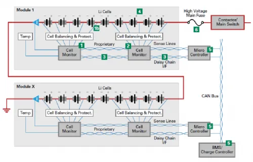 EV/HEV 中使用的电池是一个电池组,由多个电池模块的串联和并联组合。串联和并联组合是基于所需的直流侧电压和电池的能量容量配置的。串联连接产生所需的电压,并联连接为电池组的最小运行时间提供所需的容量。此外,电池组配备了充电平衡和均衡、以及电池组管理电路。电池组管理电路确保了可靠性和对过充电、过放电、短路和热过载的保护。电池组管理电路能够对电池的状况和故障进行报告。