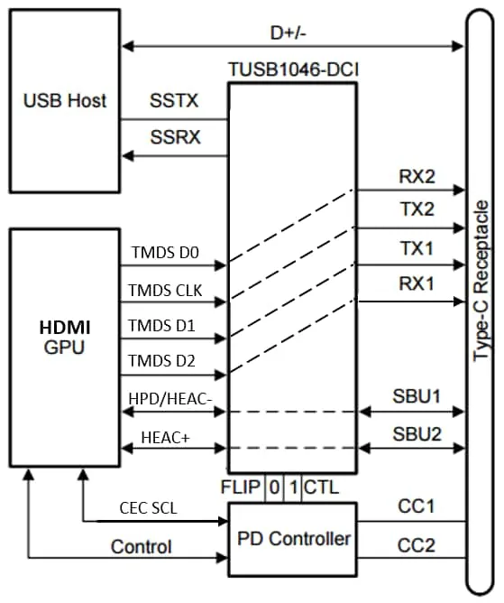 TI推出的<a href="http://www.mouser.com/ProductDetail/Texas-Instruments/TUSB1046-DCIRNQT/…;集成了可选模式多路复用器和可重驱动,其中的线性可重驱动支持Alt Mode模式下每个通道高达8.1Gbps的数据传输速率,足以满足HDMI 1.4规范的3.4Gbps的需求。尽管TUSB1046最初是为DisplayPort应用而设计的,但是它与协议无关,图8显示的是DisplayPort四通道设置,这种配置可以适配三个HDMI TMDS通道和TMDS时钟。
