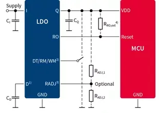 某些线性稳压器的RO输出已在器件内部设置上拉电阻。只有在需要一个更低阻抗的RO输出时,可以额外在外部连接一个到输出端Q的上拉电阻。由于RO端允许的灌入电流有最大值限制,因而数据手册中标明了外部上拉电阻RRO,ext的最小值,选择外部上拉电阻时必须遵循该最小值的规定。