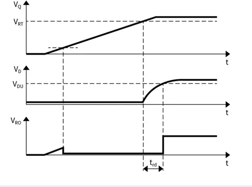 短暂的负电压尖峰不应触发输出欠压复位。只有当输出电压低于复位阈值的时间长于预定义复位响应时间时,才产生欠压复位。