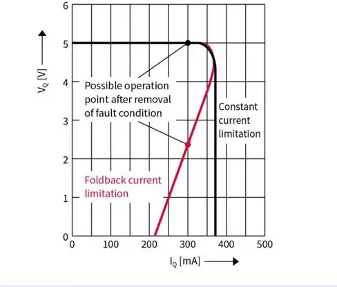 电流限制有两种实现方式:恒定或折返电流限制。贸泽电子(https://www.mouser.cn/)备有的英飞凌线性稳压器采用恒定电流限制以解决折返限制方法产生的“闩锁”问题:如果故障消失后负载电流刚好在折返曲线经过的任何地方,输出将永远无法回复其初始电压。