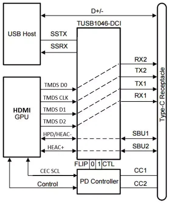 共有八个TX/RX引脚在USB模式和HDMI模式下充当高速数据通道:包括用于USB操作的USB 3.1通道、三个TMDS通道以及用于HDMI AM操作的时钟通道。