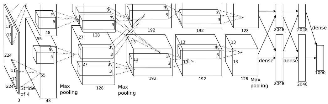 <center><img src="http://mouser.eetrend.com/files/2020-06/wen_zhang_/100049710-99015-3.pn…; alt=“图2:AlexNet的网络结构(摘自原文Krizhevsky, Alex, Ilya Sutskever, and Geoffrey E. Hinton. "Imagenet classification with deep convolutional neural networks." Advances in neural information processing systems. 2012.)” width="600"></center><center><i>图2:AlexNet的网络结构(摘自原文Krizhevsky, Alex, Ilya Sutskever, and Geoffrey E. Hinton. "Imagenet classification with deep convolutional neural networks." Advances in neural information processing systems. 2012.)</i></center>