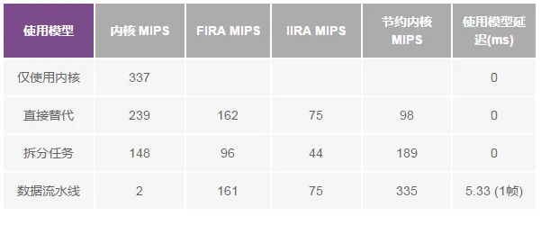 表1显示测得的内核和FIRA MIPS数量,以及与仅使用内核模型相比获得的节约内核MIPS结果。表中还显示了相应使用模型增加的额外输出延迟。正如我们所看到的,使用加速器配合数据流水线使用模型,可节约高达335内核MIPS,但导致1块(5.33 ms)的输出延迟。直接替代和拆分任务使用模型也分别可节约98 MIPS和189 MIPS,而且未导致任何额外的输出延迟。