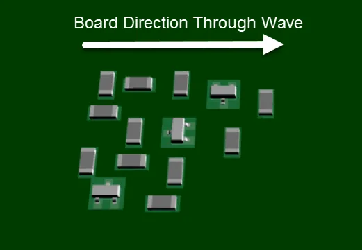 如果按照下面这样凌乱的摆放,波峰焊接对于不同器件的焊盘质量会有差异,特别当有些小型器件恰好位于大型器件之间时,就会形成“阴影”效应,小器件可能就会焊接不良。