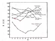 以上两种情况是针对人体在接触到电子产品时,因人体带电或其他原因引起电子产品不能工作而进行的基本测试。下图是一些地区在一年中不同月份的空气湿度统计。从图中可以看出Lasvegas全年的湿度最少,该地区的电子产品要特别注意ESD的保护。